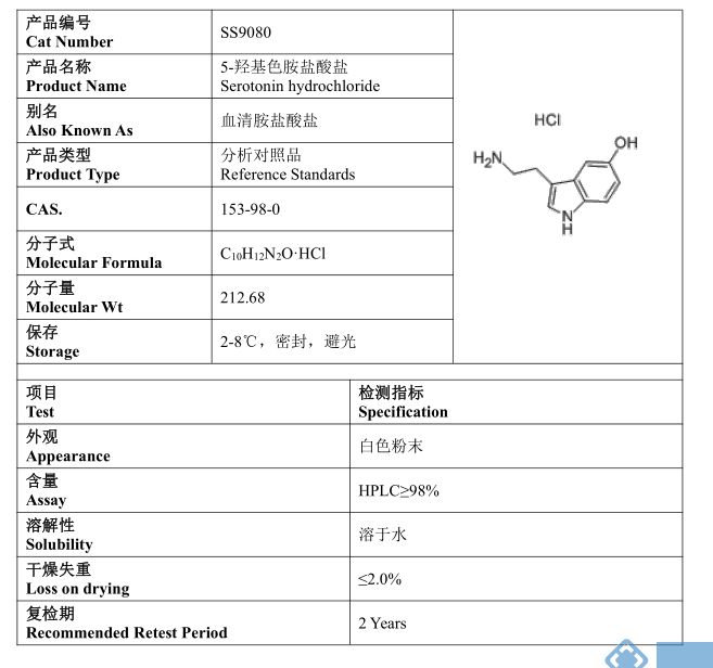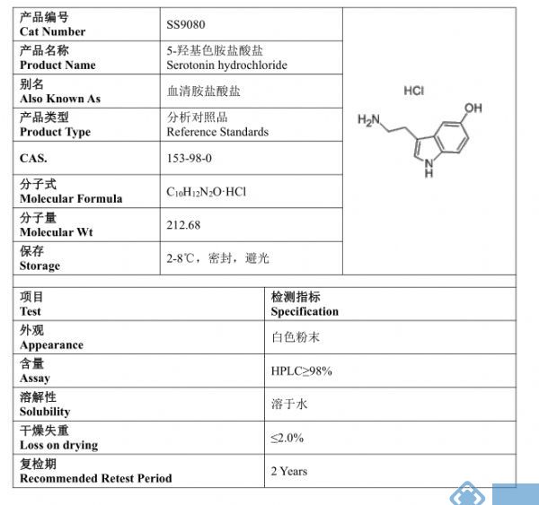 产品名称: Serotonin hydrochloride;5-羟基色胺盐酸盐