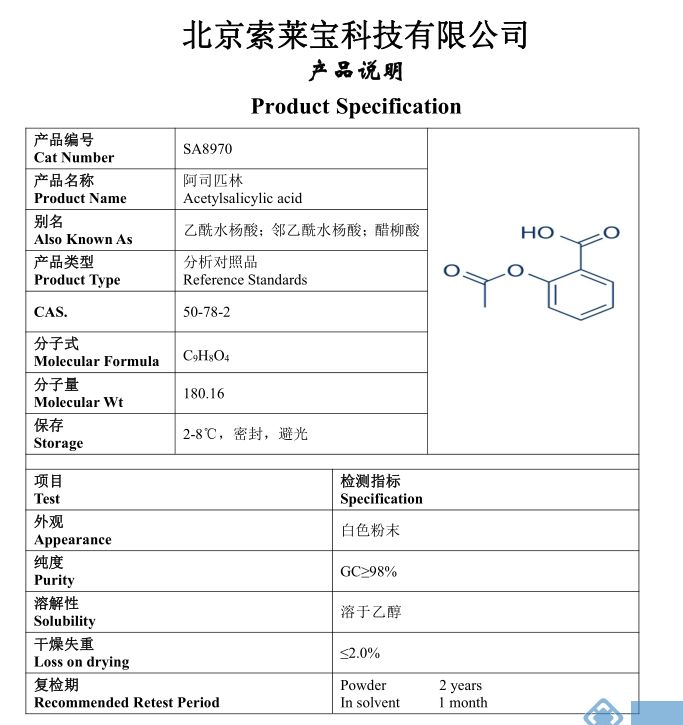 产品名称: Acetylsalicylic acid;邻乙酰水杨酸/阿司匹林